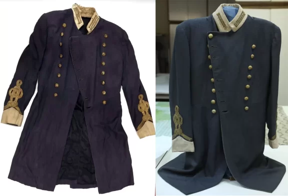 Restaurator responsabil: Iolanda Turcu Rochie cu trenă aparținând Reginei Maria, moda sfârșitului de secol al XIX-lea, din fir de argint, cu broderie de mătase, paiete, ștrasuri și mărgele cusute manual. Trena are ornamentații similare, dar contextura materialului este diferită de cea a rochiei. În privința ornamentelor, forma şi culoarea florilor – mov, culoarea preferată a Reginei – trimite subtil la ciulin, vechiul simbol heraldic al Scoţiei, integrat Coroanei britanice. Broderia este executată pe țesătura cu fir metalic susținută pe spate de o țesătură din bumbac deasă; toată rochia a fost căptușită cu mătase naturală ecru, prinsă de croiul rochiei. La mâneci este ornamentată cu tul fin și dantelă din fir metalic. Trena nu este dublată, este prezentă doar întăritura de bumbac pe zonele cu broderie florală. În partea de sus are două pliuri cu lărgimea de 12 cm care se fixează pe spatele rochiei în talie. Trena este executată din…Restaurator responsabil: Iolanda Turcu Rochie cu trenă aparținând Reginei Maria, moda sfârșitului de secol al XIX-lea, din fir de argint, cu broderie de mătase, paiete, ștrasuri și mărgele cusute manual. Trena are ornamentații similare, dar contextura materialului este diferită de cea a rochiei. În privința ornamentelor, forma şi culoarea florilor – mov, culoarea preferată a Reginei – trimite subtil la ciulin, vechiul simbol heraldic al Scoţiei, integrat Coroanei britanice. Broderia este executată pe țesătura cu fir metalic susținută pe spate de o țesătură din bumbac deasă; toată rochia a fost căptușită cu mătase naturală ecru, prinsă de croiul rochiei. La mâneci este ornamentată cu tul fin și dantelă din fir metalic. Trena nu este dublată, este prezentă doar întăritura de bumbac pe zonele cu broderie florală. În partea de sus are două pliuri cu lărgimea de 12 cm care se fixează pe spatele rochiei în talie. Trena este executată din…Mergi sus